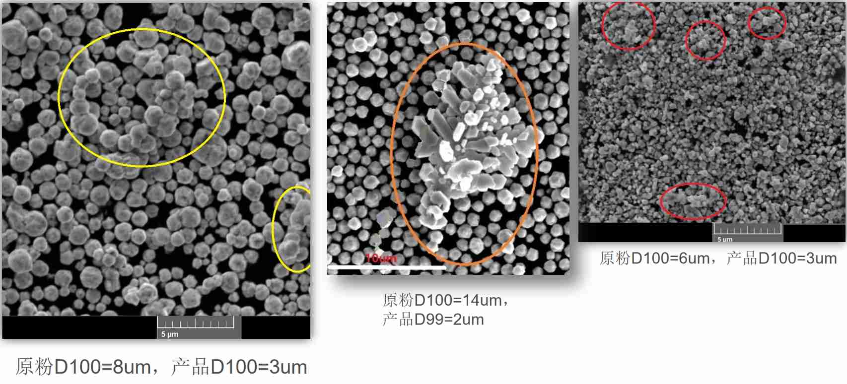 上(shàng)面這(zhè)幾張電(diàn)鏡照(zhào)片顯示的(de)是(shì)幾種常見(jiàn)的(de)團聚情況:團塊在物(wù)料中的(de)比例不(bù)高γ(gāo),通(tōng)常隻占1%-3%左右,如(rú)果隻看(kàn)D97值,粒度是(shì)很(h∞ěn)小(xiǎo)的(de),隻有(yǒu)1-2um。但(dàn)D97到(dào)D100之間(jiān)存在大(dà)團塊,直接影φ(yǐng)響了(le)粉體(tǐ)的(de)使用(yòng)價值,下(xià)遊客戶一(yī)般都(dōu)難以接Ω受。譬如(rú)應用(yòng)于光(guāng)伏闆電(diàn)極的(de)銀(yín)粉,過大(dà)顆粒✘往往是(shì)造成缺陷點、電(diàn)路(lù)異常的(de)原因。當然,超大(dà)顆粒可(kě)以通(tōng)過高(gāo)效分(>fēn)級機(jī)将團塊切割掉,但(dàn)針對(duì)超細粉的(de)可(kě)用(yòng)分(fēn)級機(jī)®選擇并不(bù)多(duō),分(fēn)級成本也(yě)比較高(gāo),而且空(kōng)氣分(fēn)級機(jī)一(yī)般都(dōu)會(∞huì)切掉10%-20%的(de)合格粉體(tǐ),這(zhè)對(duì)于高(gāo)價值(貴金(jīn)屬粉和(hé)超硬先進陶瓷物(wù)料等)的(de)物(wù)料來(lái)說(shuō)是(shì)很(hěn)大(dà)的(de)損失。通(tōng)過Pulvis的(de)研←磨實現(xiàn)原始細度,基本上(shàng)不(bù)會(huì)造成物(wù)料損失,比傳統氣流磨能(néng)耗低(dī)得(de)多(duō)。